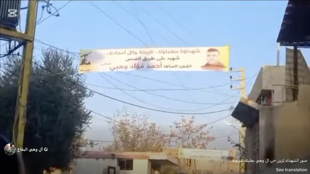 The Facebook page for the neighbourhood, Al Wahbi Al Bekaa, announced that “Verses from the Holy Quran [would] be recited for their pure souls” during the funeral. In addition to the named civilians, Hussein Fouad Wahbi was included in this post. A member of the family, Hussein, had been killed prior, on 21 November. Though sources included him to reflect the family association and his recent death, he was not included in the civilian casualty ranges for this incident.