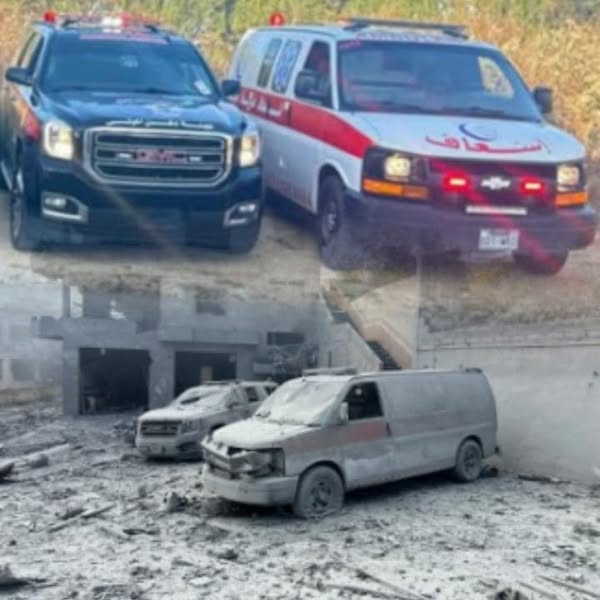 Many pictures of the aftermath of the airstrikes circulated online showing the destroyed ambulance and vehicle, surrounded by dust, rubble and flames. Other images captured the three paramedics at the hospital after receiving medical care as they exited the facility. They can be seen covered in dust but smiling despite the minor injuries suffered. Indeed, they have bandages on their arms and legs. One of them, apparently the youngest, is in a wheelchair, possibly due to a broken leg.