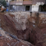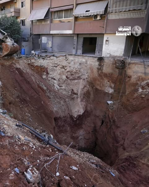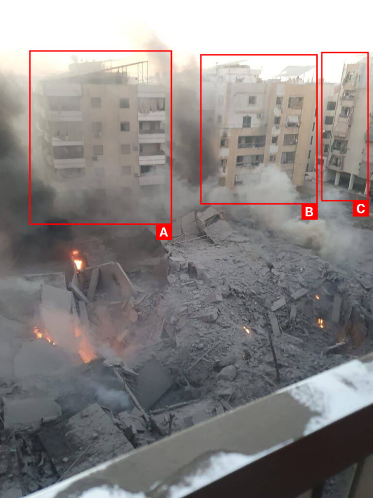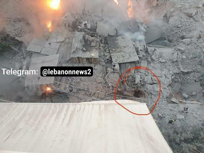 Posting to Telegram on September 27th, LebanonNews shared an image of the destruction. Taken from an aerial vantage, the image shows grey-scale rubble, with flash points of fire visible in the background. A red circle has been drawn around a point in the image in which a round hole is visible. LebanonNews’ accompanying caption reads “Bunker-penetrating missile entry point”.