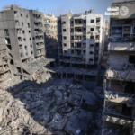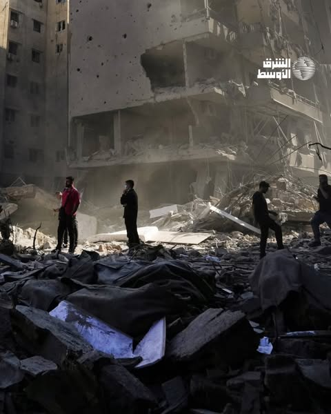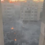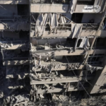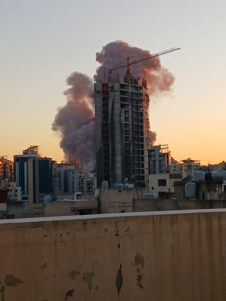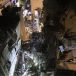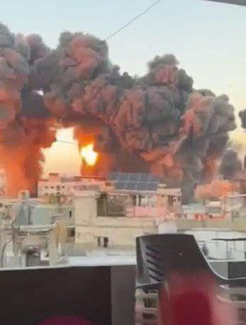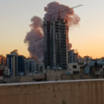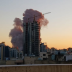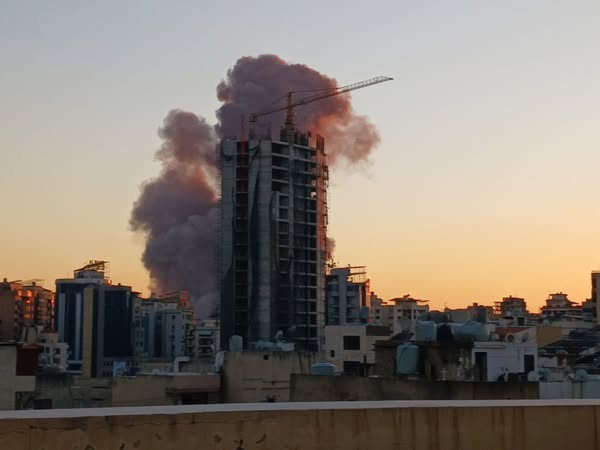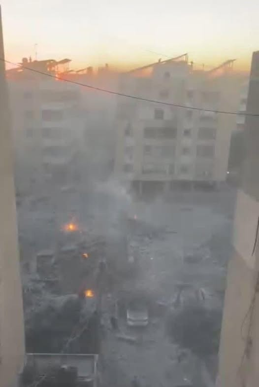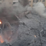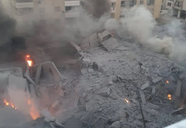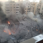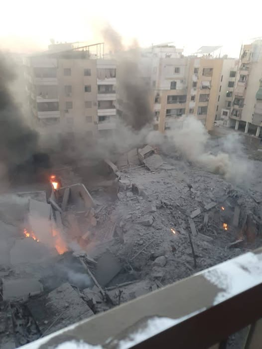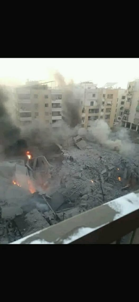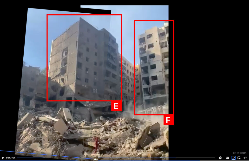 Accompanying many of these early announcements of the strikes were images, most taken from the vantage points likely offered by balconies of neighbouring buildings, in which the dusty remnants of large multi-story housing units are seen. Flames shoot out of the rubble at various points.