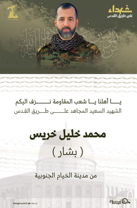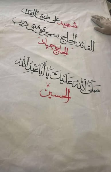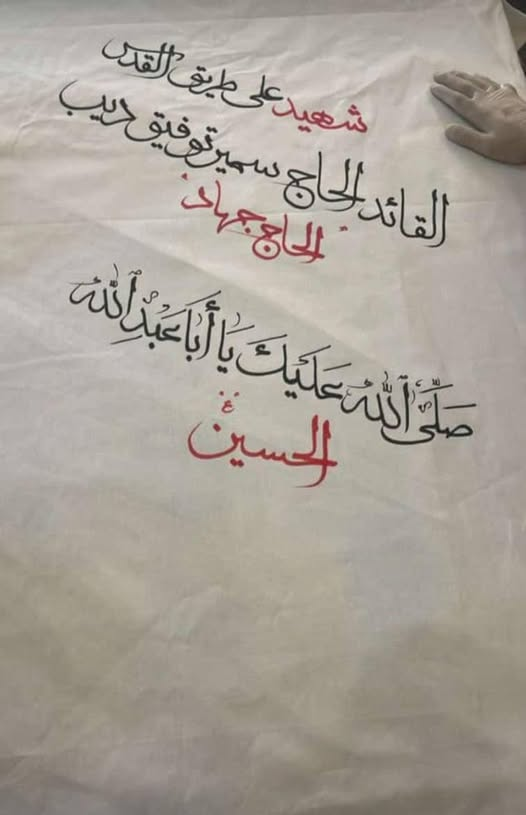 On September 28th, 2024, Twitter/X users like @OALD24 and @dyaakaddoor shared an image of a white cloth, on which the words “martyr on the path to Jerusalem” is embroidered in Arabic calligraphy, followed by “The Commander Al-Hajj Samir Tofiq Deeb, Al-Hajj Jihad” and “May Allah’s blessings be upon you, O Aba Abdillah, Al-Hussein”. Sharing the image, @OALD24 wrote “Hezbollah officially has confirmed the death of senior leader and one of its key founders, Samir Tawfiq Dib, known as Haj Jihad. He was killed alongside Hassan Nasrallah and other very important Hezbollah leaders in yesterday’s Israeli airstrike on the southern suburbs of Beirut.”