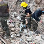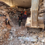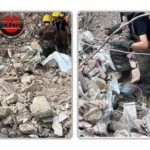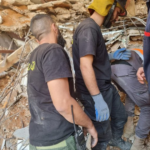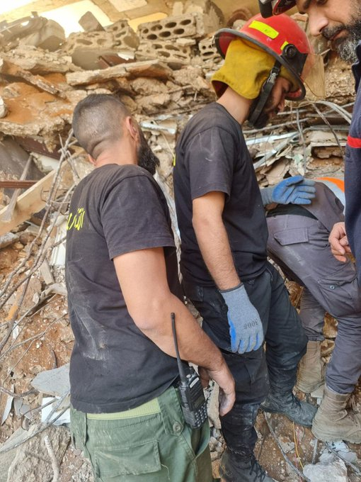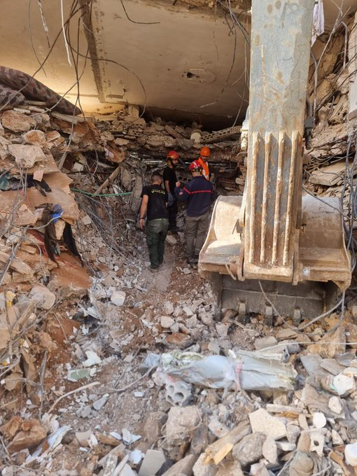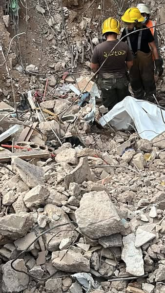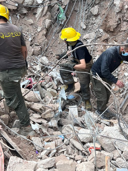 Later in the day, CivildefenseLB posted an update, writing “Search operations in Haret Hreik end after finding the seven missing persons”. The account specified that, after retrieving “the bodies of 4 martyrs from under the rubble in the Haret Hreik area”, as Civil Defense personnel had found “three missing persons yesterday”, all seven missing persons had been found. Accompanying the text were two images of men in yellow hard hats and brown t-shirts on which “civil defense” is written. The men are seen in pits of rubble, surrounded by concrete and metal fragments.