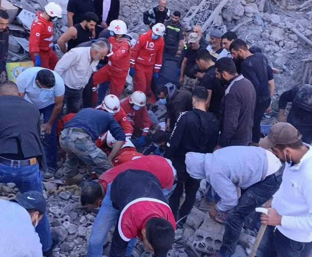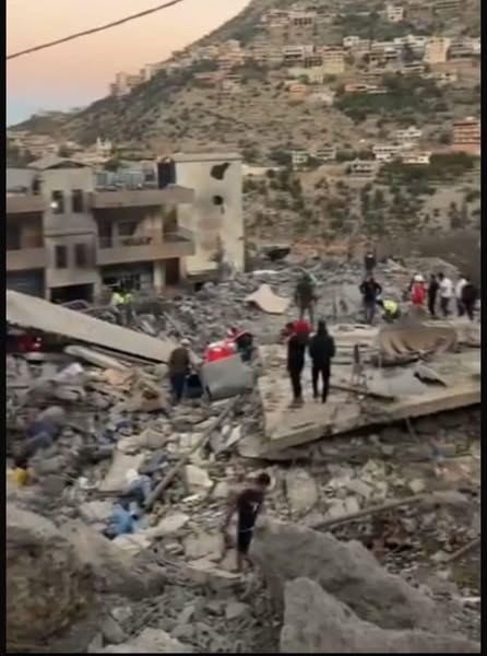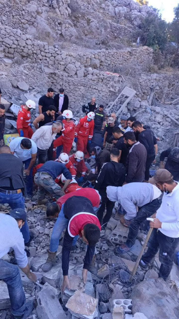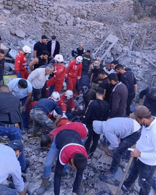 Multiple sources, including Tripoli wataniye on Facebook, shared an image of the rescue efforts where at least five paramedics, wearing red uniforms and white helmets, attempted to remove rubble and retrieve the bodies, assisted by residents. JbeilDistrict was one of the accounts which shared the photo. The post included the text “Ambulance teams continue to work to remove rubble from the targeted building in Shebaa, Lebanon, searching for missing persons, after 9 bodies were recovered this morning.”
