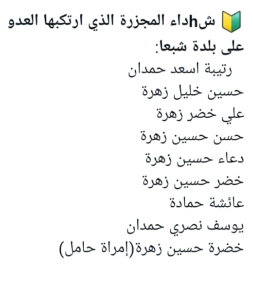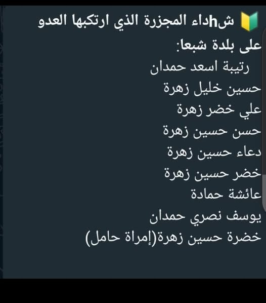 The information about nine casualties from one family in Shebaa was voiced by Al-Sharq correspondent from Beirut, Maha Hoteit, in a video report shared by Al-Aharq Now on Facebook. The Telegram account of Lebanon News provided the names of the nine victims.
