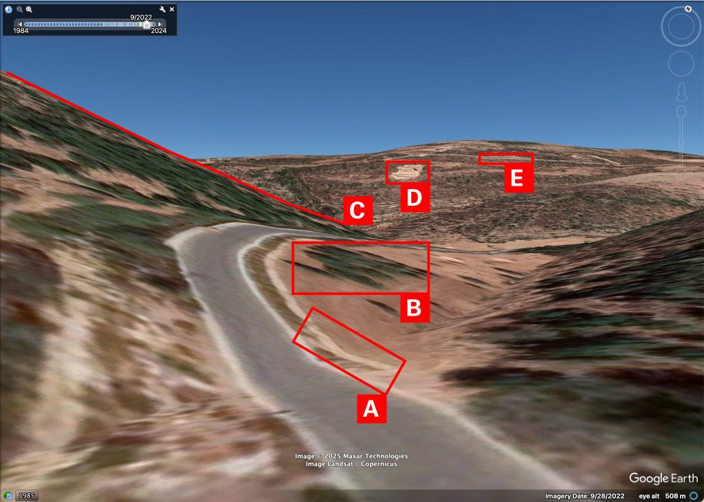 {"type":"FeatureCollection","features":[{"type":"Feature","properties":{"label":"Exact Location","label-type":"black-white"},"geometry":{"coordinates":[35.34864151651613,33.13989512369675],"type":"Point"}},{"type":"Feature","properties":{"label":"B","label-type":"white-red","stroke":"#ff0000","stroke-width":1,"stroke-opacity":1,"fill-opacity":0},"geometry":{"coordinates":[[[35.34826922230468,33.140566294757036],[35.34826922230468,33.140195522329634],[35.34853690445334,33.140195522329634],[35.34853690445334,33.140566294757036],[35.34826922230468,33.140566294757036]]],"type":"Polygon"}},{"type":"Feature","properties":{"label":"D","label-type":"white-red","stroke":"#ff0000","stroke-width":1,"stroke-opacity":1,"fill-opacity":0},"geometry":{"coordinates":[[[35.34495331582232,33.149297679034504],[35.34495331582232,33.148619037271715],[35.34555457537428,33.148619037271715],[35.34555457537428,33.149297679034504],[35.34495331582232,33.149297679034504]]],"type":"Polygon"}},{"type":"Feature","properties":{"label":"E","label-type":"white-red","stroke":"#ff0000","stroke-width":1,"stroke-opacity":1,"fill-opacity":0},"geometry":{"coordinates":[[[35.346384019273614,33.15014220645118],[35.346442504452824,33.15004001614457],[35.34719009762523,33.15036148941533],[35.34713415527793,33.150455163524896],[35.346384019273614,33.15014220645118]]],"type":"Polygon"}},{"type":"Feature","properties":{"label":"G","label-type":"white-red","stroke":"#ff0000","stroke-width":1,"stroke-opacity":1,"fill-opacity":0},"geometry":{"coordinates":[[[35.34937656195481,33.13921073217446],[35.34937656195481,33.139115825501094],[35.34949415463774,33.139115825501094],[35.34949415463774,33.13921073217446],[35.34937656195481,33.13921073217446]]],"type":"Polygon"}},{"type":"Feature","properties":{"label":"F","label-type":"white-red","stroke":"#ff0000","stroke-width":1,"stroke-opacity":1,"fill-opacity":0},"geometry":{"coordinates":[[[35.34945306803792,33.139126502507054],[35.34945306803792,33.13892890628611],[35.34956549584891,33.13892890628611],[35.34956549584891,33.139126502507054],[35.34945306803792,33.139126502507054]]],"type":"Polygon"}},{"type":"Feature","properties":{"label":"A","label-type":"white-red","stroke":"#ff0000","stroke-width":1,"stroke-opacity":1,"fill-opacity":0},"geometry":{"coordinates":[[[35.348542284029634,33.13987465542762],[35.34868230569526,33.1397355356266],[35.34871783358045,33.139762659630065],[35.3485788568525,33.13990177938807],[35.348542284029634,33.13987465542762]]],"type":"Polygon"}}]}