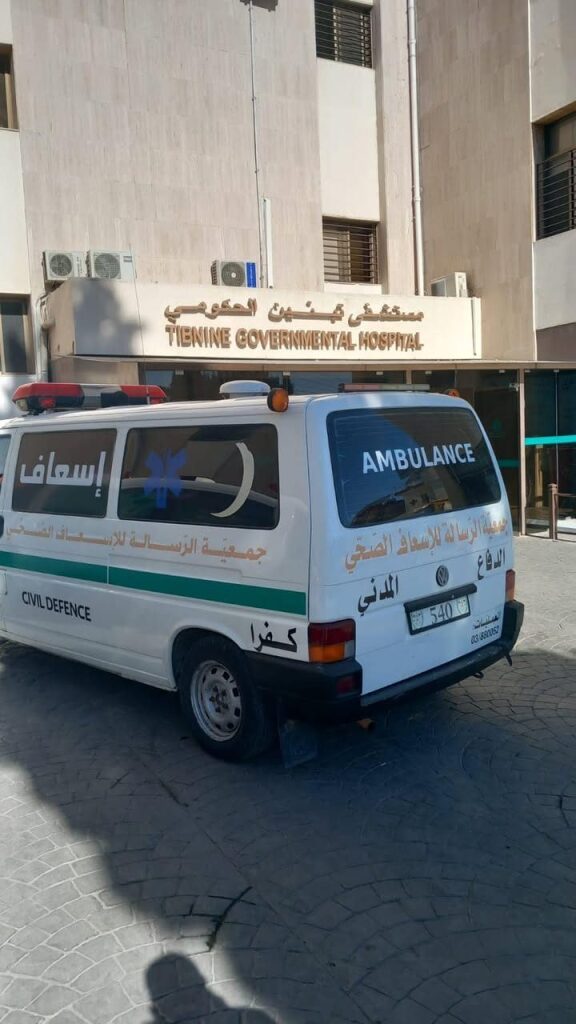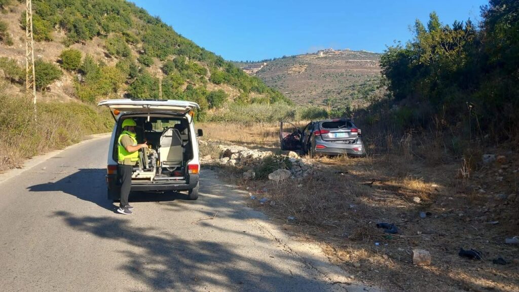 The team also reportedly worked to “reopen roads blocked by airstrikes.” The post is accompanied by an image of the 540 ambulance parked outside of the “Tibnine Governmental Hospital” (مستشفى تبنين الحكومي), as well as another image of a vehicle – presumably ambulance 540 – parked on the road, the struck car sitting haphazardly in the enbankment off the road.