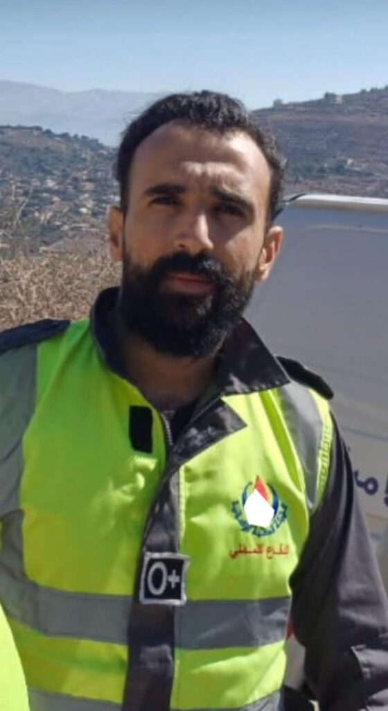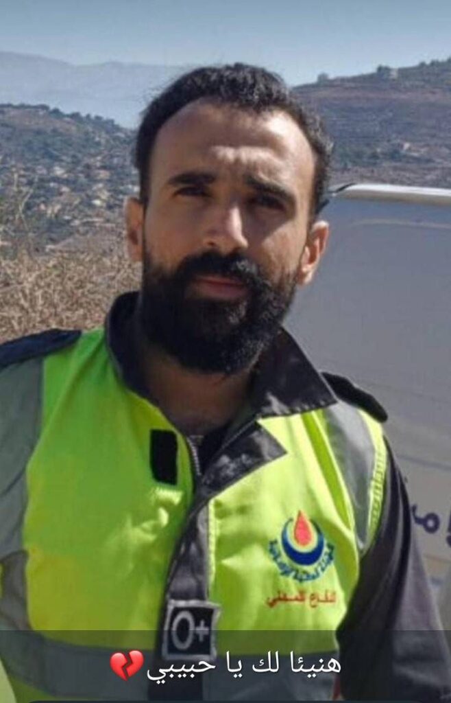 Friends and relatives, including Fadi M Reslan, Ali Safadi, and Sada Odaisseh-three shared to Facebook in Ahmed’s honour. Fadi and Ali both shared pictures of Ahmed in a yellow day-glo vest with the Islamic Health Authority’s logo featuring prominently over his left breast. Sada Odaisseh-three wrote: “With immense pride and honor, the town of Adissa mourns the martyr Ahmed Ali Hussein Youssef Raslan.” Sada’s post specified that Ahmed was killed in an Israeli strike on “the Islamic Health Authority center in the town of Deir Siryan.”