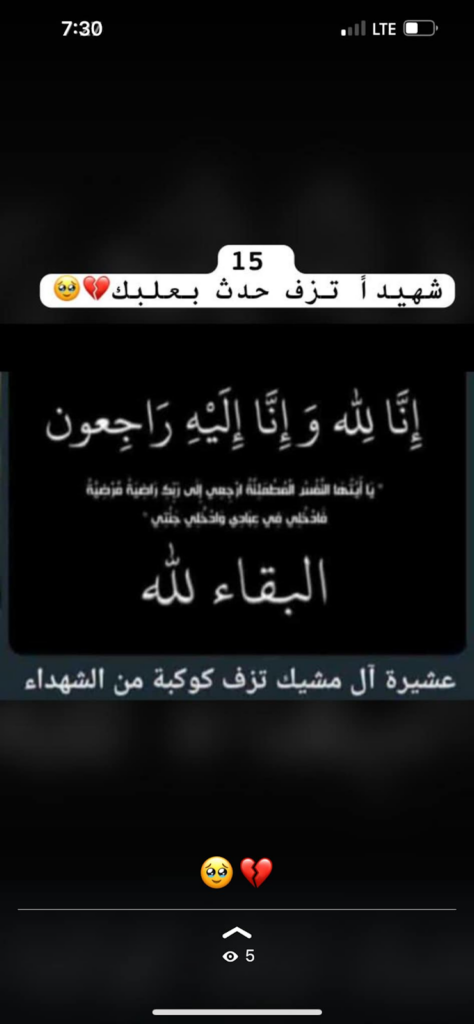 The Facebook account “Dia Na” wrote, “Hadath Baalbek mourn 15 martyrs.” There was no additional information on the victims. The post also specified that the “al-Mishik clan” was mourning the “martyrs”, indicating that those killed were from the al-Mishik clan.