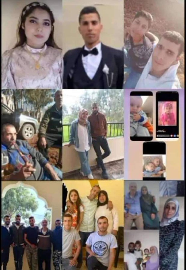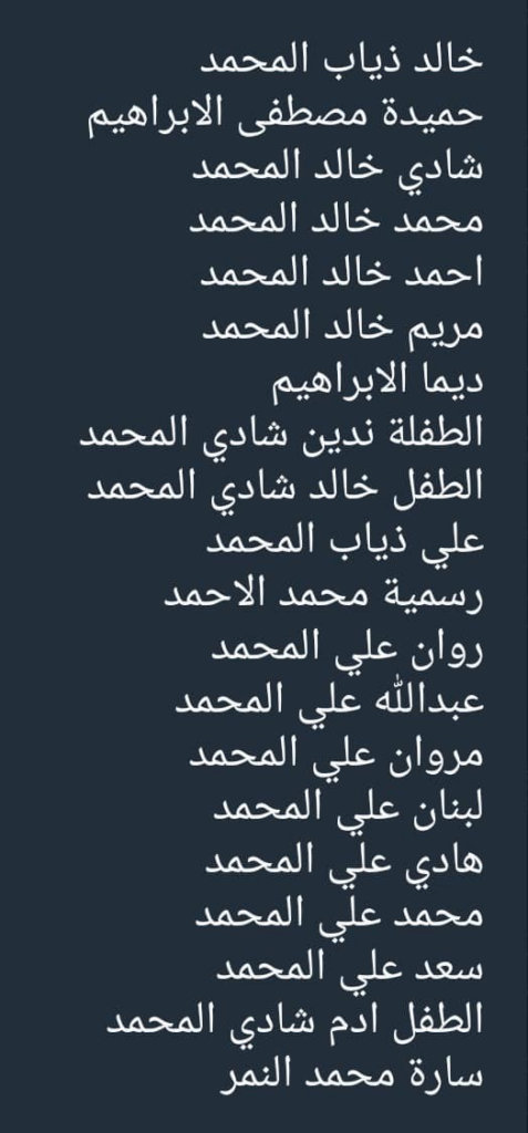 The names of 20 individuals including those mentioned above circulated online: From al-Muhammad family, the civilians presumed dead but still under the rubble are: Khaled Diab al-Muhammad, Shadi Khaled al-Muhammad, Muhammad Khaled al-Muhammad, Ahmad Khaled al-Muhammad, Mariam Khaled al-Muhammad, Ali Diab al-Muhammad, Abdallah Ali al-Muhammad, Marwan Ali al-Muhammad, Lubnan Ali al-Muhammad, Hadi Ali al-Muhammad, Muhammad Ali al-Muhammad and Saad Ali al-Muhammad.