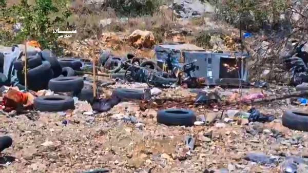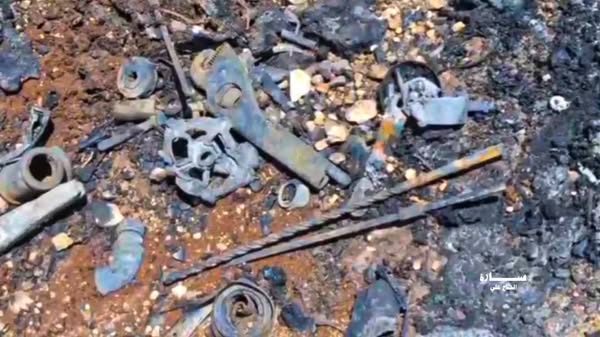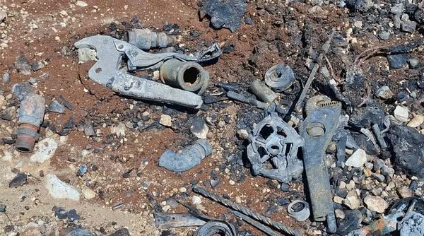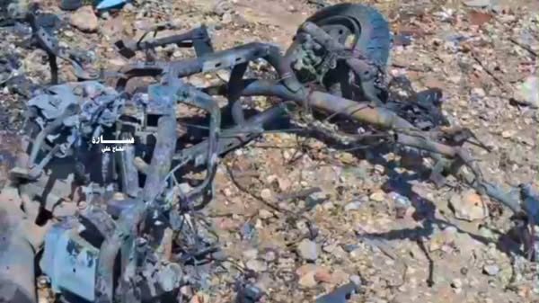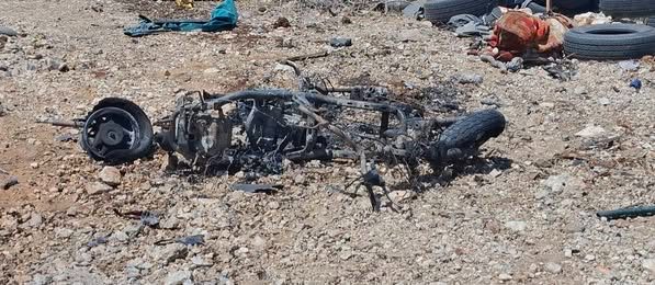 Several accounts such as @دومينو سياسية / Political dominoes (Facebook) noted that Mahmoud was killed while he was riding his motorcycle, with images shared by Facebook users @Sara Al Haj ali reportedly show the charred remains of his bike. The background of the images also show the remains of equipment that was ostensibly impacted in the strike as well – with burnt metal, tires and other material lying charred on the ground. There is no mention of any remains of the explosive used in the strike visible in the images.