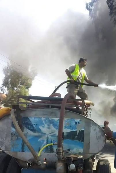 Mahmoud is described by multiple sources (e.g. @AmalKhalil83 X.com) as ‘hardworking’. Accompanying pictures show a middle-aged man with a mustache, wearing a yellow vest; another showed Mahmoud participating in what seems to be an Ashura event for Shia Muslims, wearing a white t-shirt with blood or red paint dripping down his head and over his shirt, and holding a toy sword or knife. In another picture, Mahmoud stands on top of a water truck and sprays water onto a fire. Others show a middle-aged man standing by a door, wearing a black jacket and coat, and holding a green scarf.