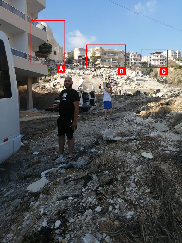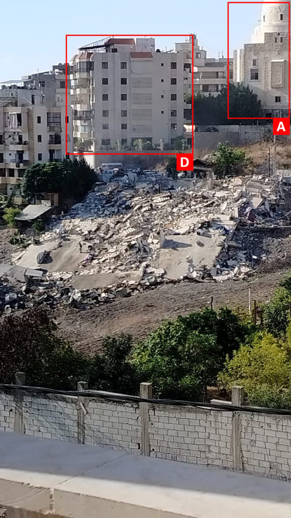 The same day, Beirutiyya Facebook page shared a video of a residential building collapsing with the caption “in front of the camera, an entire building collapses. A raid on the Ain al-Delb area east of the city of Sidon in southern Lebanon on Sunday afternoon led to the destruction of an entire building and its leveling to the ground. It was said that it contained the home of one of the party’s officials in the area.” The video filmed from afar showed a large cloud of smoke rising above residential buildings, accompanied by the sirens of ambulances. An image also attached to the post showed the rubble left on the site of the demolished building.