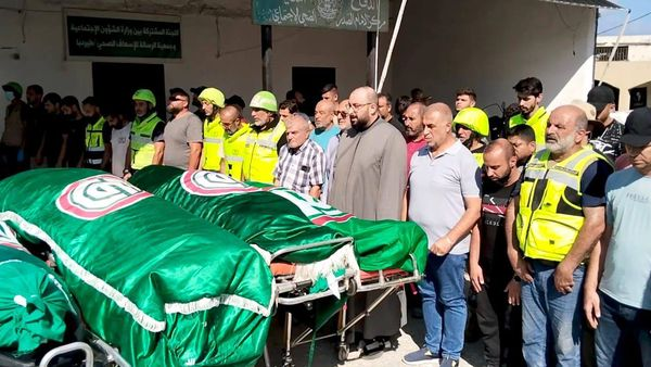 A picture shared by Habbouch news on Facebook showed paramedics in their uniforms standing in a line and praying before the shrouded bodies during the burial service in the town cemetery. The post caption said: “Yesterday they were tending to wounds, and today we are bleeding them as heroes.”