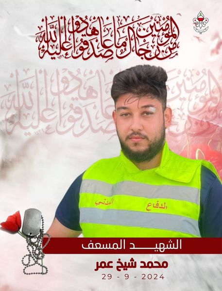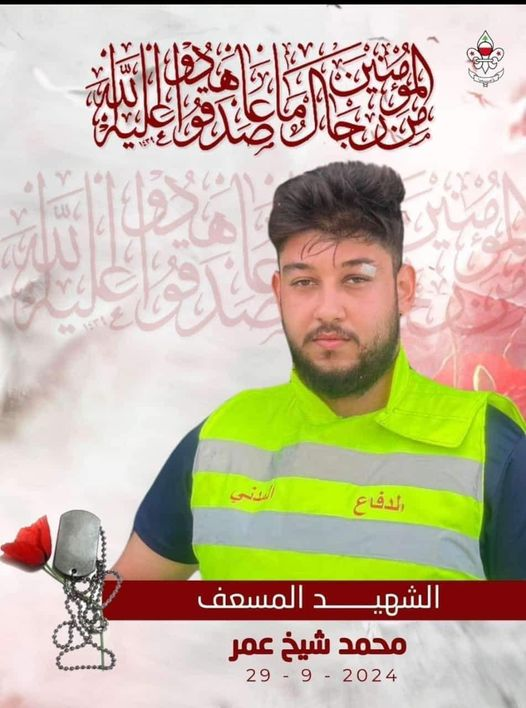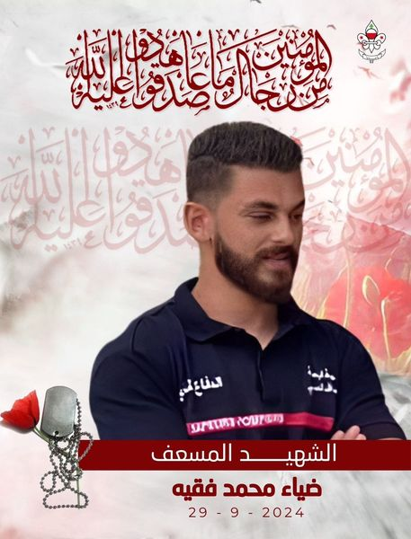 Others mourned the death of Diaa Muhammad Saeed Fakih. Amal Hamoud posted a picture of him at the gym on Facebook. Sariah Hussein Harissy, who is the cousin of Fakih’s mother, also mourned his death on Facebook, sharing pictures of him including one with his paramedic vest. Mohammad Ezzedin on Facebook shared pictures of Diaa, describing him as a “cheerful and polite young man, whose smile never left his face,” and said that he “remained stationed throughout the war in his town of Tairdaba and did not retreat for a moment from serving his people in the town.” He added that Diaa “is attested to his nobility, generosity, chivalry and courage.”
