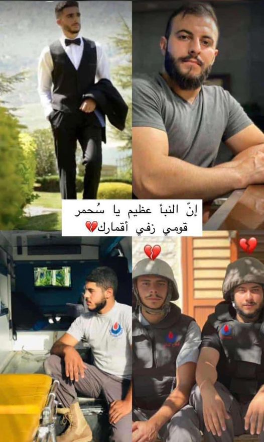 Friends and family provided further testimonies to others killed in the strike. Ahmad Zein posted an emotional video with several photos of Hassan Qasim Alaa El-Din, depicting him in various settings, including in his paramedic uniform, highlighting his active community involvement and the widespread affection for him, as seen in numerous tributes, especially from his fiancée, Facebook user Ghadeer AD. In one of the posts Ghadeer wrote: “You broke our hearts, I swear.” In another post she shared her grief over the loss of her beloved: “It’s over, Hassan, you left us and fled? ? How can we stay up late? With whom do I want to joke and laugh, you sweet laugh? And your hot life has died. The talk has stopped. We want joy after you, and our hot soul has stopped. Your eyes are the most beautiful eyes and your laugh is the most beautiful laugh. You will remain in our hearts forever, oh Groom, my little one?? God be with you, my soul.. We will miss you so much, you flower of the neighborhood’s youth..?”