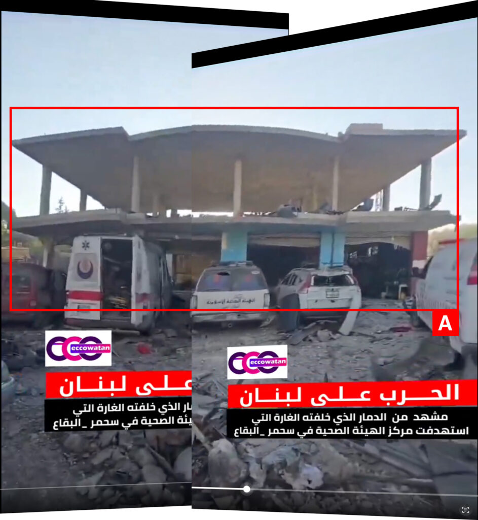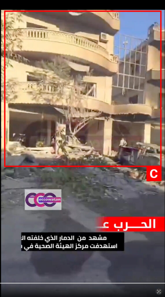 A video shared by Mehr News Arabic shows the aftermath of the incident, with the Health Center’s structure completely destroyed, and fires still burning. The Center was only identifiable by the ambulances parked in an adjacent structure that remained intact. Another video, posted on Abdul Kader Albay’s Facebook page, depicted a similar scene: a large fire consuming what appears to be a truck—possibly an ambulance—while other ambulances were parked in the nearby structure. A third video, shared by EccoWatan, showed the site in daylight hours after the fires were contained, revealing the full extent of the devastation. Almost nothing remained of the Islamic Health Authority facility.