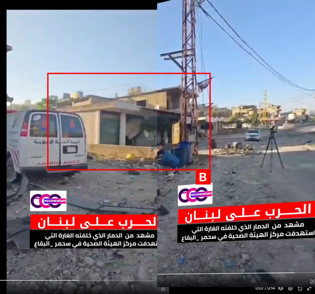 Reports of the incident mention the Health Authority Center (مركز هيئة الصحة) being struck in the town of Sahmar (سحمر). Analysing audio-visual material from sources, we have narrowed the location down to the following exact coordinates: 33.525744, 35.696774.