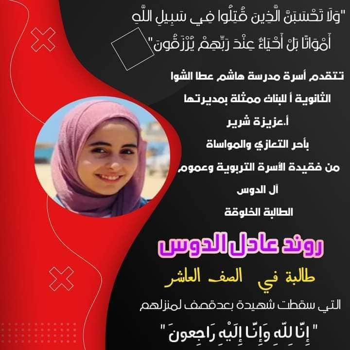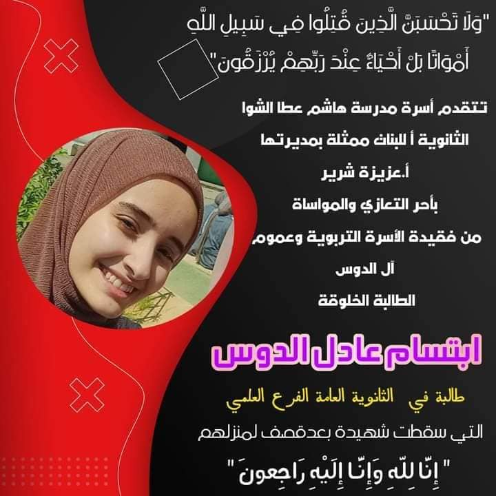 A post from Nrmeen Mamdouh identified Ibtisam Adel Awni Al-Dous as a student who received a grade of 100% during her 11th academic year. Shuhada Al-Zaytoun Basic School for Boys offered condolences to “the brilliant student” Awni Adel Awni Al-Dous. Another post identified Awni as a Youtuber who wanted to be famous. Yahya Al Jamal described Omar Awni Al-Dous (Abu Karim) as patient, polite, genuine, cheerful and kind-hearted.