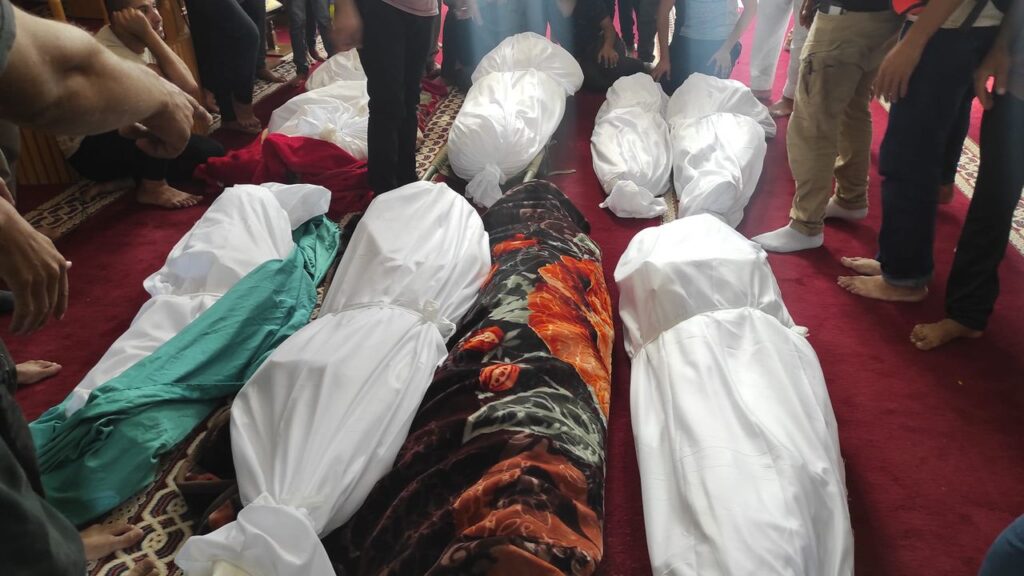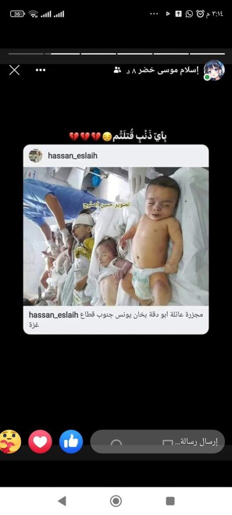 Saeed Abu Daqqa posted on Facebook that this was the family of Yasser (Muhammad) Abu Daqqa, 28 years old, who is currently being detained in an Israeli prison, with nine years remaining until his release. It was not immediately clear what Yasser Abu Daqqa was detained for. The victims included his mother 68-year-old Zainab Abu Daqqa, his siblings 33-year-old Hassan Muhammad Abu Daqqa and 33-year-old Hussein Muhammad Abu Daqqa, and their wives and their children. Based on familial names, Hussein’s children seven-year-old Lian Hussein Abu Daqqa, six-year-old Judy Hussein Abu Daqqa, three-year-old Sham Hussein Abu Daqqa, two-month-old Muhammad Hussein Abu Daqqa, and his twin sister Aseed Hussein Abu Daqqa were among those killed.