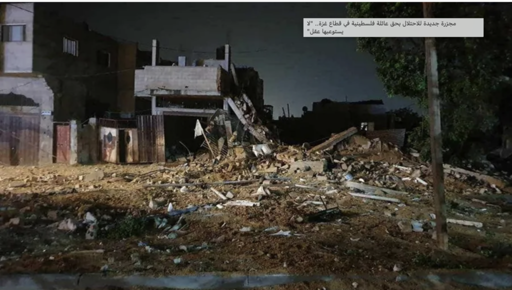 Arabi 21 spoke with another relative of the family named Bakr Abu Qouta who provided additional details: “The entire family was sitting at home safely, the children were playing and eating, and suddenly we did not realize what had happened; the house was turned upside down. There were many [dead] under the rubble and wounded as well. The bodies of the [dead] were recovered in pieces.”