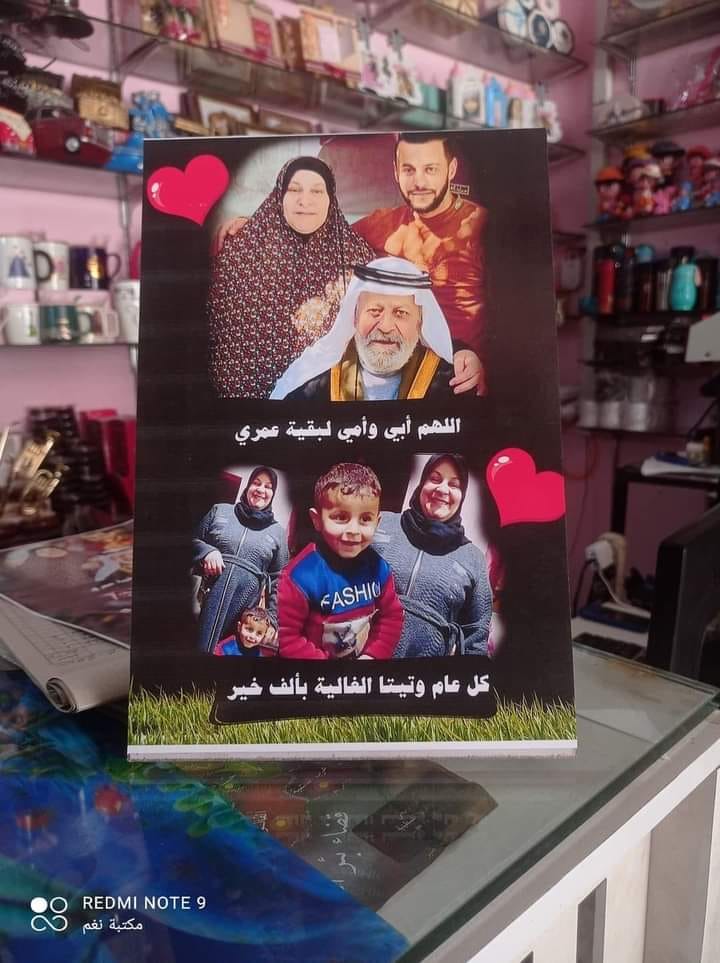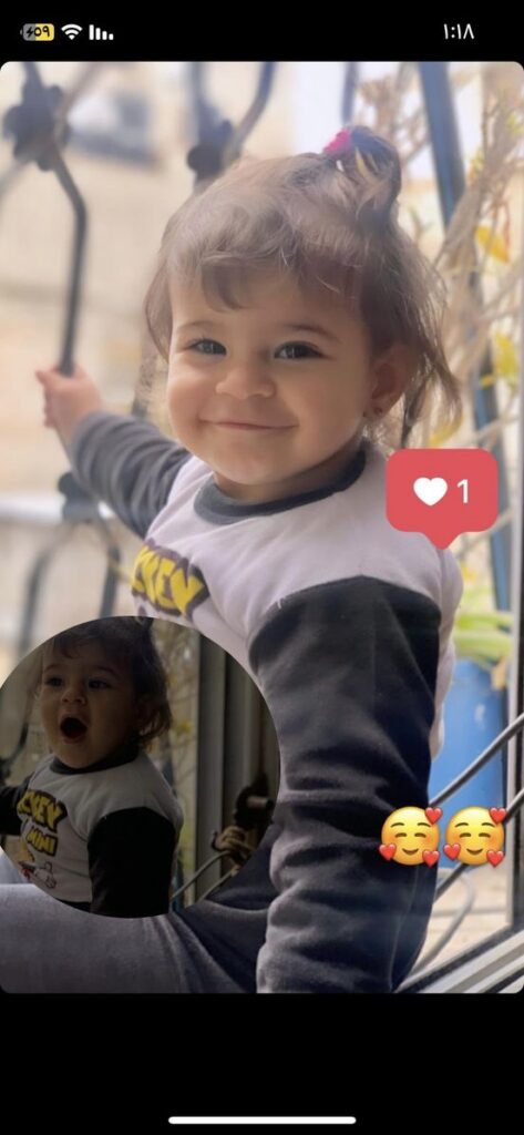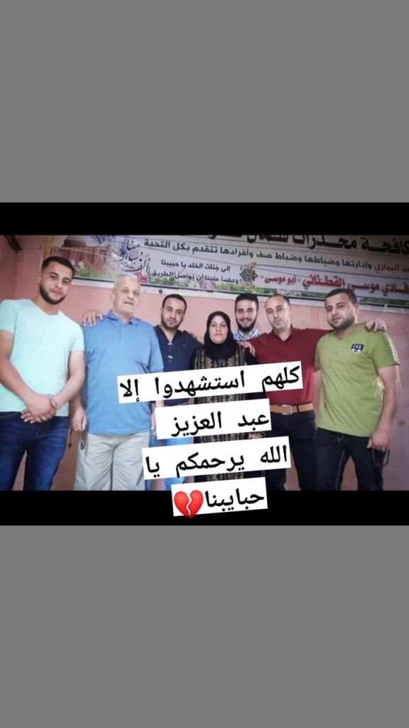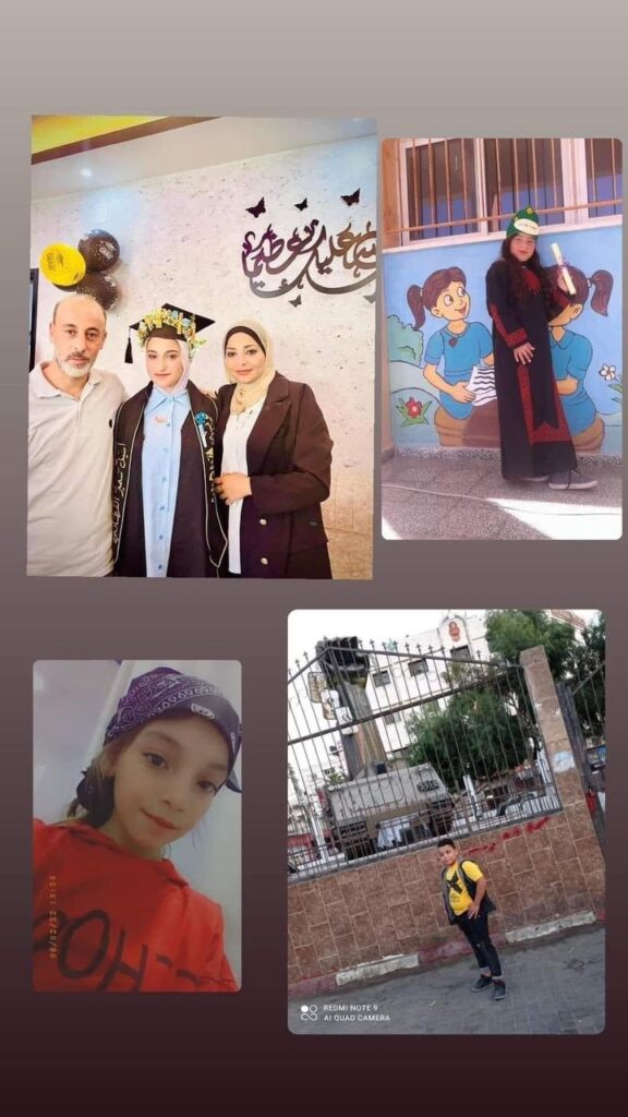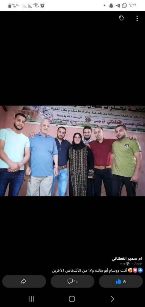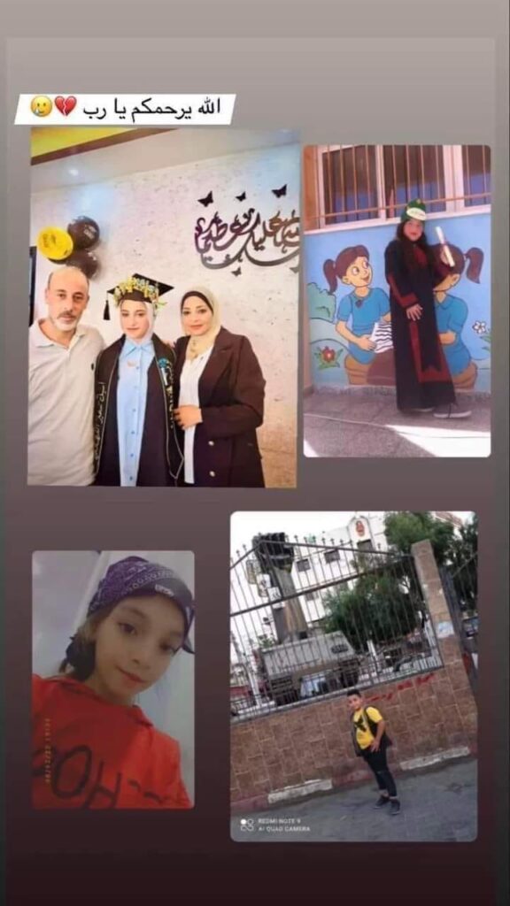 35-year-old Rana Nasser Abd al-Aziz al-Shalab (Samir al-Qatnani’s wife) was killed alongside their four children – 18-year-old daughter Aseel Samir Musa al-Qatnani, Basma Samir Mousa al-Qatnani (16), Mohammad Samir Mousa al-Qatnani (13), and Sally Samir Mousa al-Qatnani (11). Relatives posted generally that Abu Samir and Umm Samir, their three children, each of their wives, and their grandchildren were killed. Children of Omar Musa Samir, one-year-old Jawan Omar Mousa al-Qatnani (also reported as Joan) and three-year-old Ali Omar Mousa al-Qatnani were also killed. Rana al-Shalabi’s mother posted that her daughter Rana and Rana’s children were also killed. While the two other members of the family killed have not been named, it is not known where Rana and Samir’s daughter Aleem was at the time of the strike.