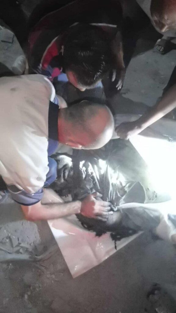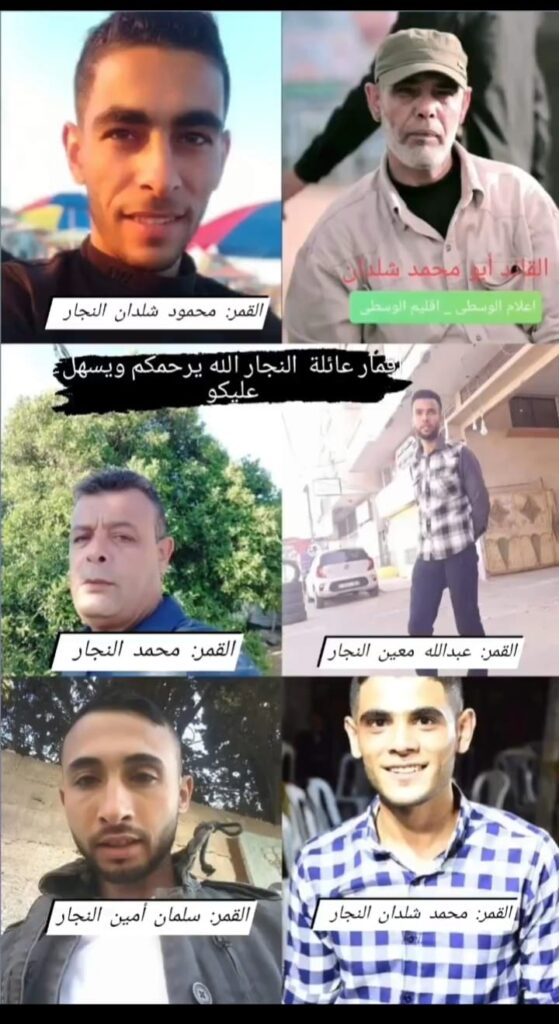 In a Facebook post by Amjad Abuljoud reported the names of the victims: Suzan Sobhi Abdel Salam al-Najjar (41), Nadeem Suleiman Salman al-Najjar (20), Safaa Suleiman Salman al-Najjar (1), Farah Suleiman Salman al-Najjar (24), Muhammad Shaldan Salman al-Najjar (26), Mahmoud Shaldan Salman al-Najjar (25), Ruba Shaldan Salman al-Najjar (17), Rawan Shaldan Salman al-Najjar (22), Amjad Khattab (Samir Al-Najjar), Rana Ahmed Yacoub (Abdel Majeed Al-Najjar, 23), Moin Suleiman Moin Salman al-Najjar (6), Zain Suleiman Moin Salman al-Najjar (2 months), Jawd Suleiman Moin Salman al-Najjar (4), Abdullah Moin Salman al-Najjar (23), Zuwaid Moin Salman al-Najjar, Salman Amin Salman al-Najjar (32), and Hanan Tabaza al-Najjar (Ahmed Muhammad Al-Najjar, 55). A post by Ahmad Arafat added Youssef Bakr Muhammad Abu Thuraya (30).