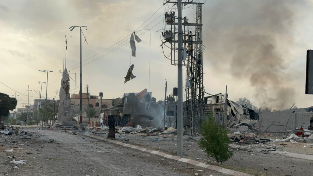 Reports of the incident mention Abasan Al Kabira (عبسان الكبيرة) to the east of Khan Younis (خان يونس). Analysing audio-visual material from sources, we have narrowed the location down to the following exact coordinates: 31.326601, 34.342172.