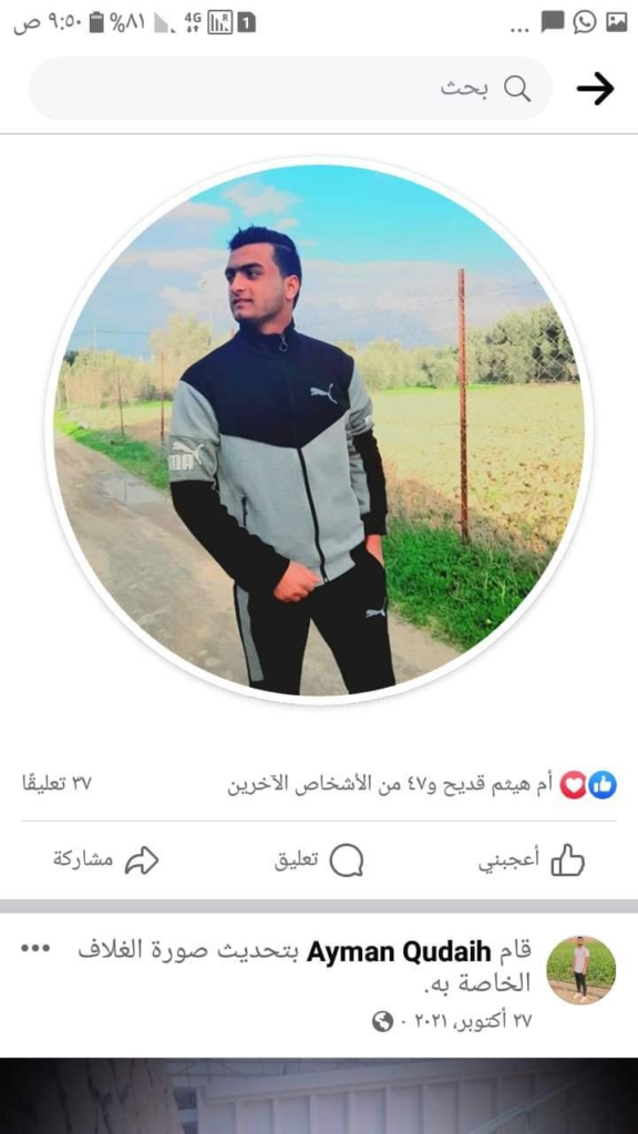 Brothers Muntaser Jumaa Qadeeh (35 years old) and Alsayed Jumaa Qadeeh (33 years old) were also killed. Mahmoud S Qudaih posted a condolence message to his “companion, the lover of my heart, my friend, and my brother whom my mother did not give birth to” Muntaser.