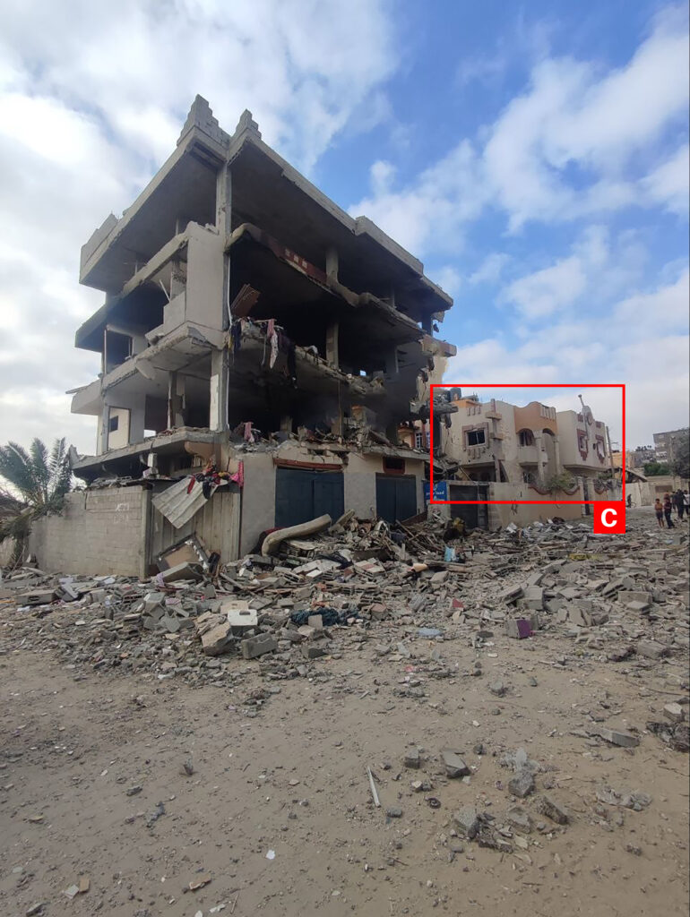 Reports of the incident mention a residential building being struck in the Nuseirat camp (مخيم النصيرات). Analysing audio-visual material from sources, we have narrowed the location down to the following exact coordinates: 31.452680, 34.395334.