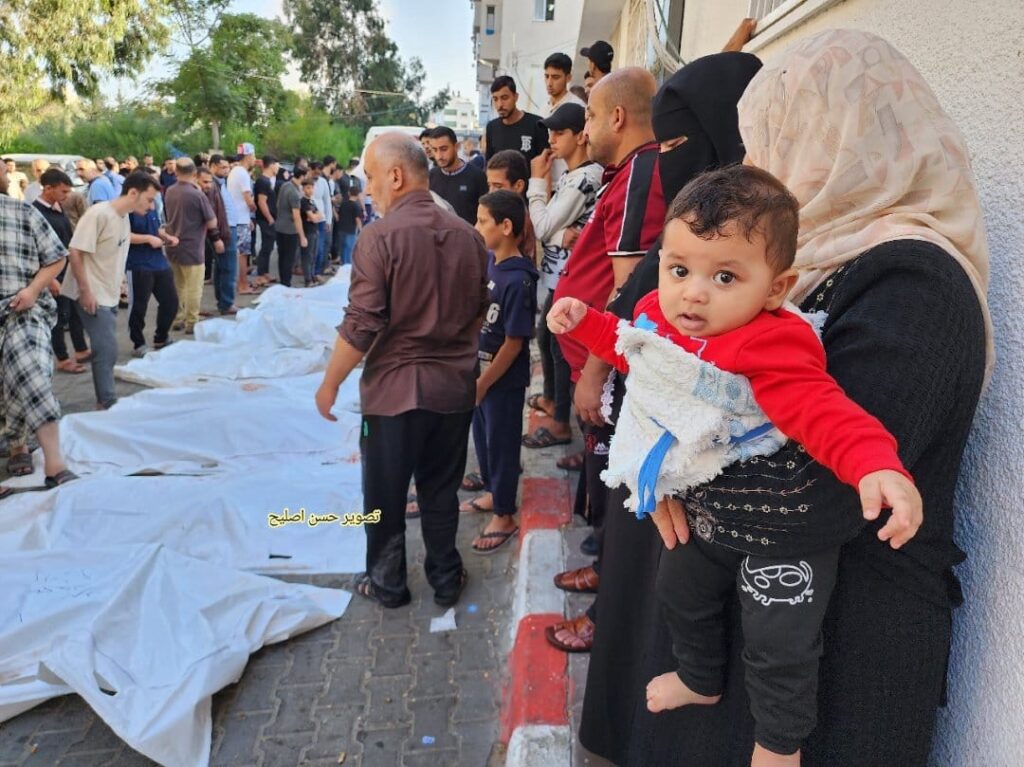 A post by Facebook user Atef Naimi shows a photo of a woman holding a baby with a red sweater and a wisp of brown hair next to a row of what appear to be white body bags. “Walid Khaled Al-Sarhi is carried by his grandmother,” the caption reads, ”not knowing that his father [likely Khaled Akram Al-Sarhi, identified as Abu Walid, or ‘father of Walid’] is among the bodies of the martyrs of the Zaytoun neighborhood.”