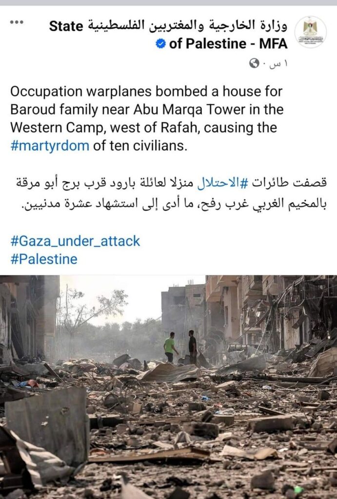 During the morning of Thursday, October 12th 2023, between 12 and 14 civilians, including at least five women and four children, were killed, and at least 40 civilians, including a number of children, were injured in an alleged Israeli airstrike on two homes in the Tal al-Sultan area of Rafah that belonged to the Baroud and Abu Shaar families.