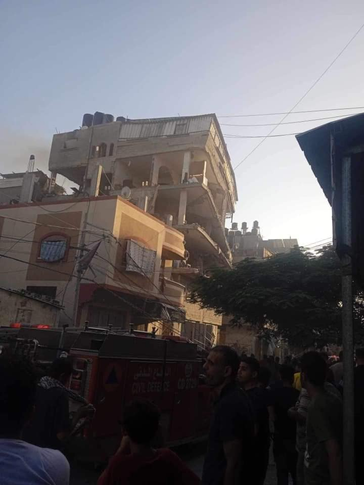 The strike which reportedly occured without a prior warning hit the centre of the Nuseirat camp, an UNRWA camp that accommodates thousands of Palestinian refugees in the central Gaza strip. Abu Fayez posted a video on Facebook showing the immediate aftermath of the strike, a severely damaged four-storey residential building and several wounded people being carried away.