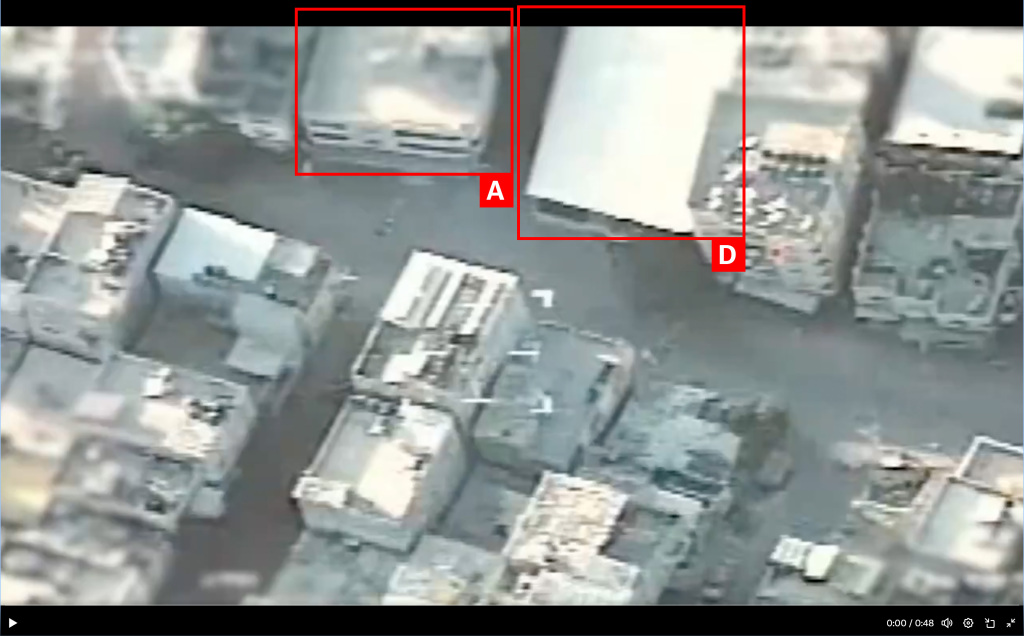 Reports of the incident mention Al Nuseirat Camp 2 (مخيم النصيرات 2) northeast of Deir Al Balah (دير البلح). Analysing audio-visual material from sources, we have narrowed the location down to the following exact coordinates: 31.441022, 34.382483. Reports of the incident mention the vicinity of the Nuseirat camp (مخيم النصيرات). Analysing audio-visual material from sources, we have narrowed the location down to the following exact coordinates: 31.458824, 34.389414. The Airwars team matched these exact coordinates to a screenshot taken at 0:00 of the strike video shared by the IDF to Twitter/X (see strike reports below)