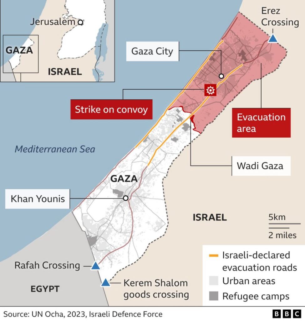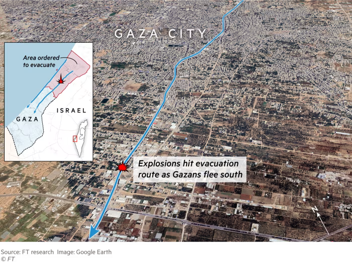 According to an investigation carried out by the Financial Times and Airwars, the deadly explosions took place between the State Roundabout and the Kuwait Roundabout near the Bassem Aliwa Steel Company building. The incident occurred the day after Israel told more than one million civilians living in northern Gaza to flee south for their own safety.