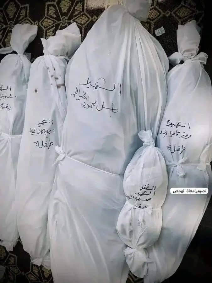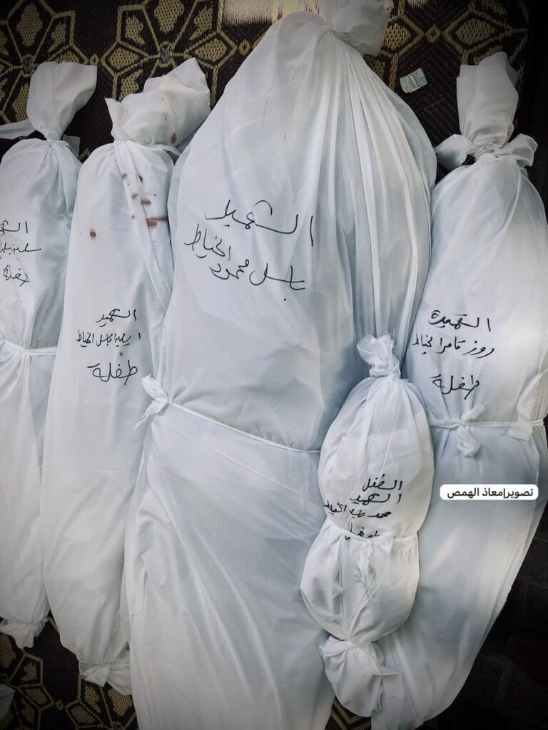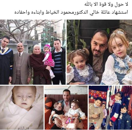 Moaz Al-Hams wrote in a Facebook post “A family deleted from the civil registry?Al Khayyat”, suggesting that the entire family was killed. He shared several images of the white shrouds with the bodies of the family members killed.