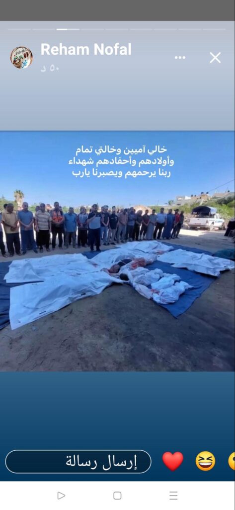 The State of Palestine’s Ministry of Foreign Affairs commented on the bombing in a Facebook post, calling it a “massacre against the Nofal family in Gaza”. It also shared the pictures of the destroyed family house and of the list of victims in Arabic.