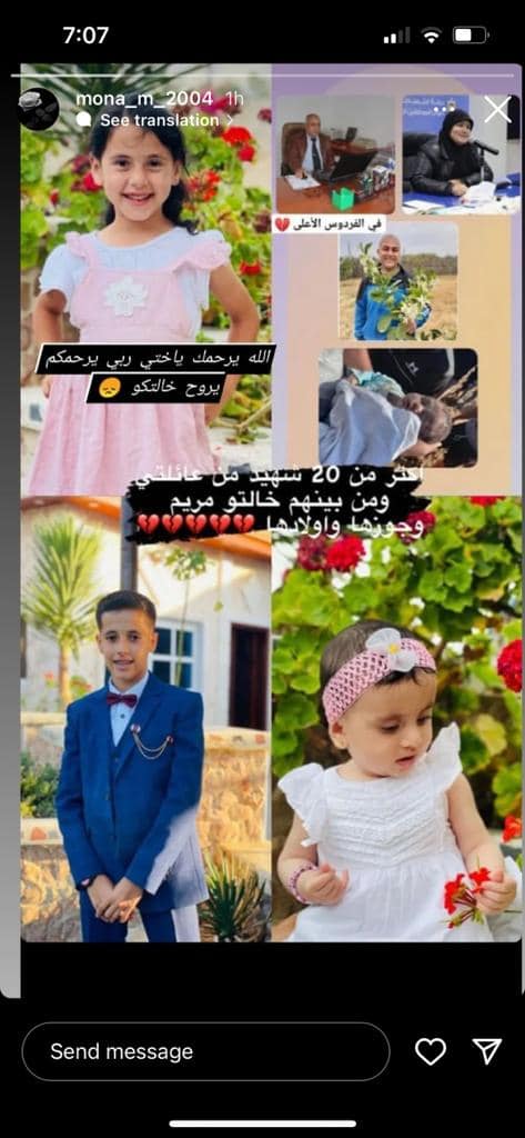 Facebook account Nusayrat camp reported about 27 killed members of the Nofal family, having attached a picture of some of the victims. A tribute by Intisar Nofal on Facebook shared the images of the destroyed Nofal family house, pictures of the young children killed in the attack, including a smiling girl in a pink dress, and the list of the victims in Arabic language.