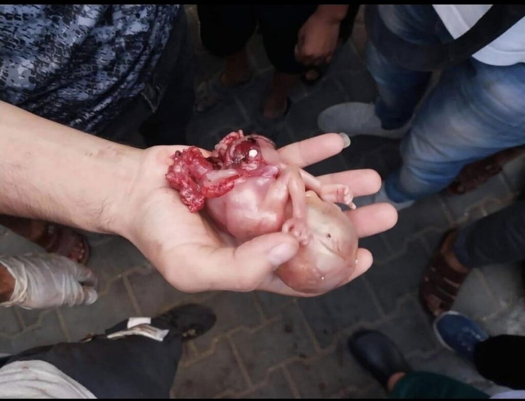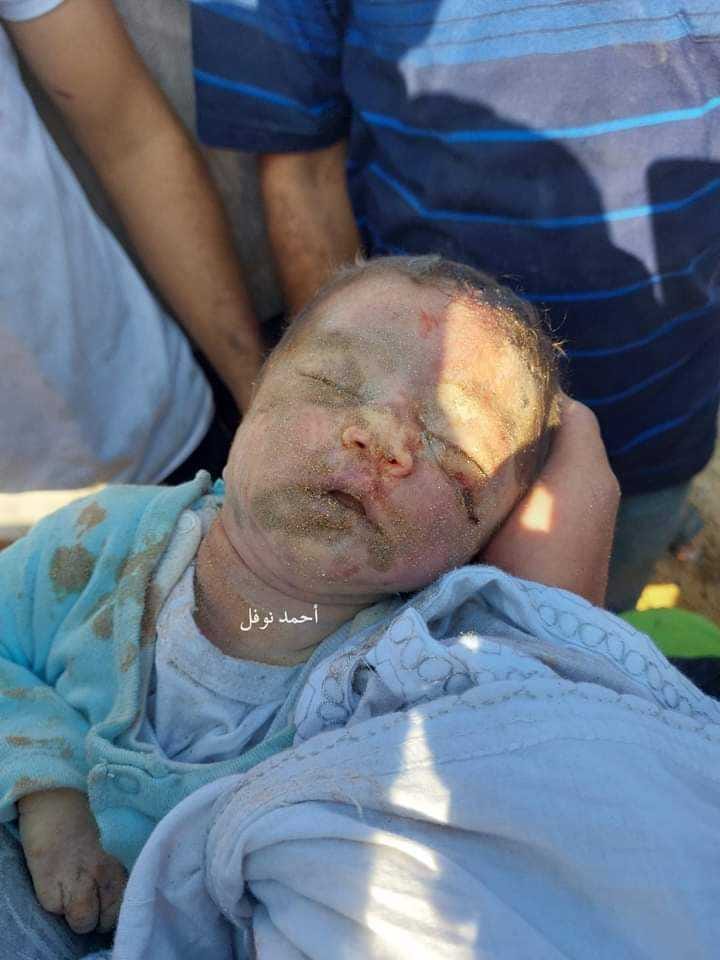 According to social media reports, the strike also took the life of a pregnant woman. A Facebook user Abu Hazin wrote a heartbreaking tribute from the perspective of the infant Nabila and a fetus of the pregnant woman, attaching the graphic images of the fetus and of the body of Nabila wrapped in a green cloth: “They promised me there [would be] air after the fluids of the womb, but I found nothing but dust…I knew that we were born in the place where no one cares.”