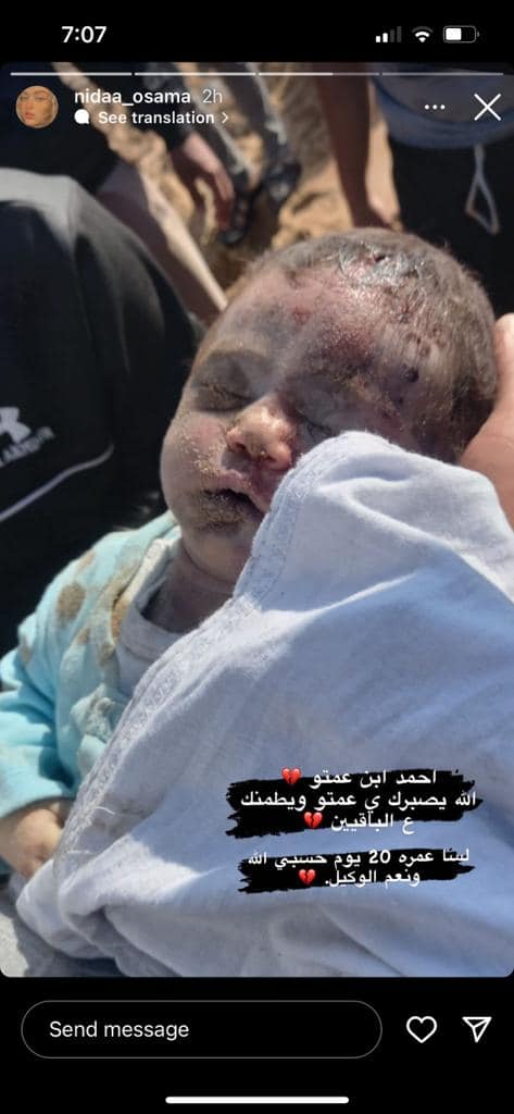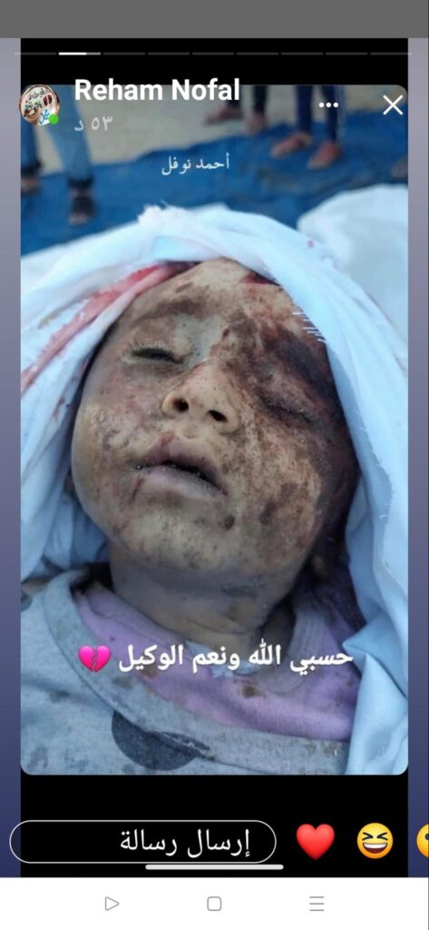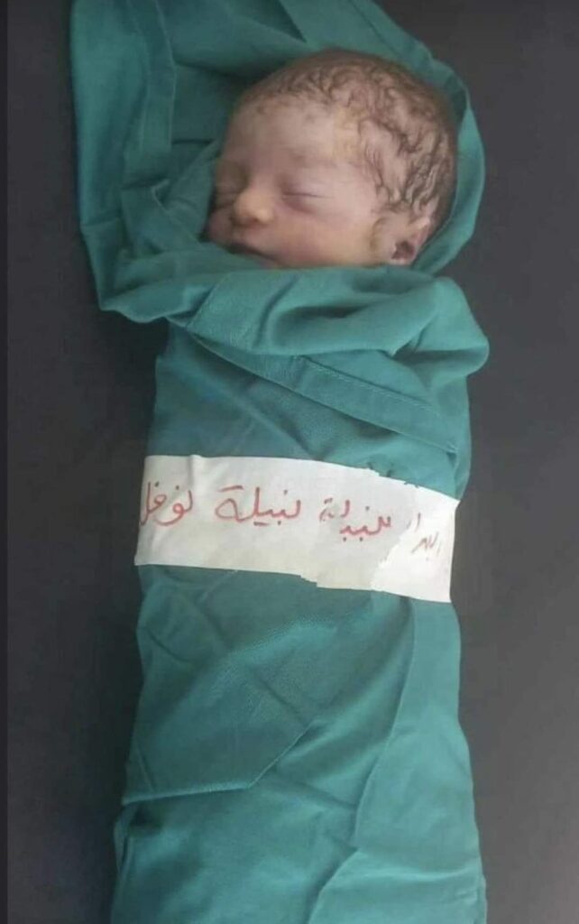 The deadly attack also killed a seven-day-old child Nabilah Nofal, dubbed “the youngest martyr in Gaza” by Donya news. She was reportedly born the day the war began on October 7th. The Palestine’s Ministry of Foreign Affairs shared a video showing the shrouded body of Nabilah alongside her mother also killed in the strike. The MFA commented on the video: “The Nofal family massacre: The mother is always safety in life, and in Gaza she is also safety, even in death! The video is of an infant, one of the youngest martyrs in the Gaza Strip, being placed next to her martyr mother as they rose with the rest of the family as the Israeli war machine bombed their home over their heads.”