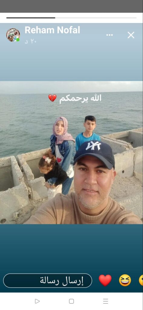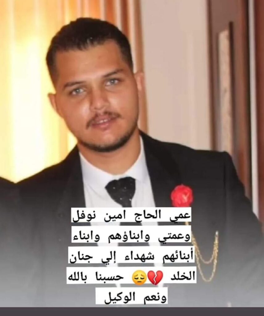The eldest son 35-year old Moatasem Amin Nofal lost his life alongside the lives of his wife, a 34-year old Maryam Muhammad Nofal and their four children: a 14-year old son Ahmed Moatasem Nofal, an 11-year old son Ali Moatasem Nofal, a 1-year old daughter Fatima Moatasem Nofal and a 6-year old daughter Amna Moatasem Nofal. Yamen Nofal shared an image of Moatasem Nofal where he appears as a young man in a palestinian scarf.
