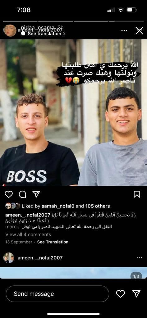 Ameen and Tammam’s other son Muhammad Amin Nofal lost his three sons in the deadly attack: a 16-year old Amin Muhammad Nofal, an 11-year old Hamza Muhammad Nofal, and an infant Ahmed Muhammad Nofal. One post by Yamen commemorating Amin Muhammad Nofal shows a young man posing for a photo with what appears to be a gun, raising the question of whether he was connected to militant activity. However, this is the only photo showing him with a gun, and does not necessarily mean he was a member of an armed group.