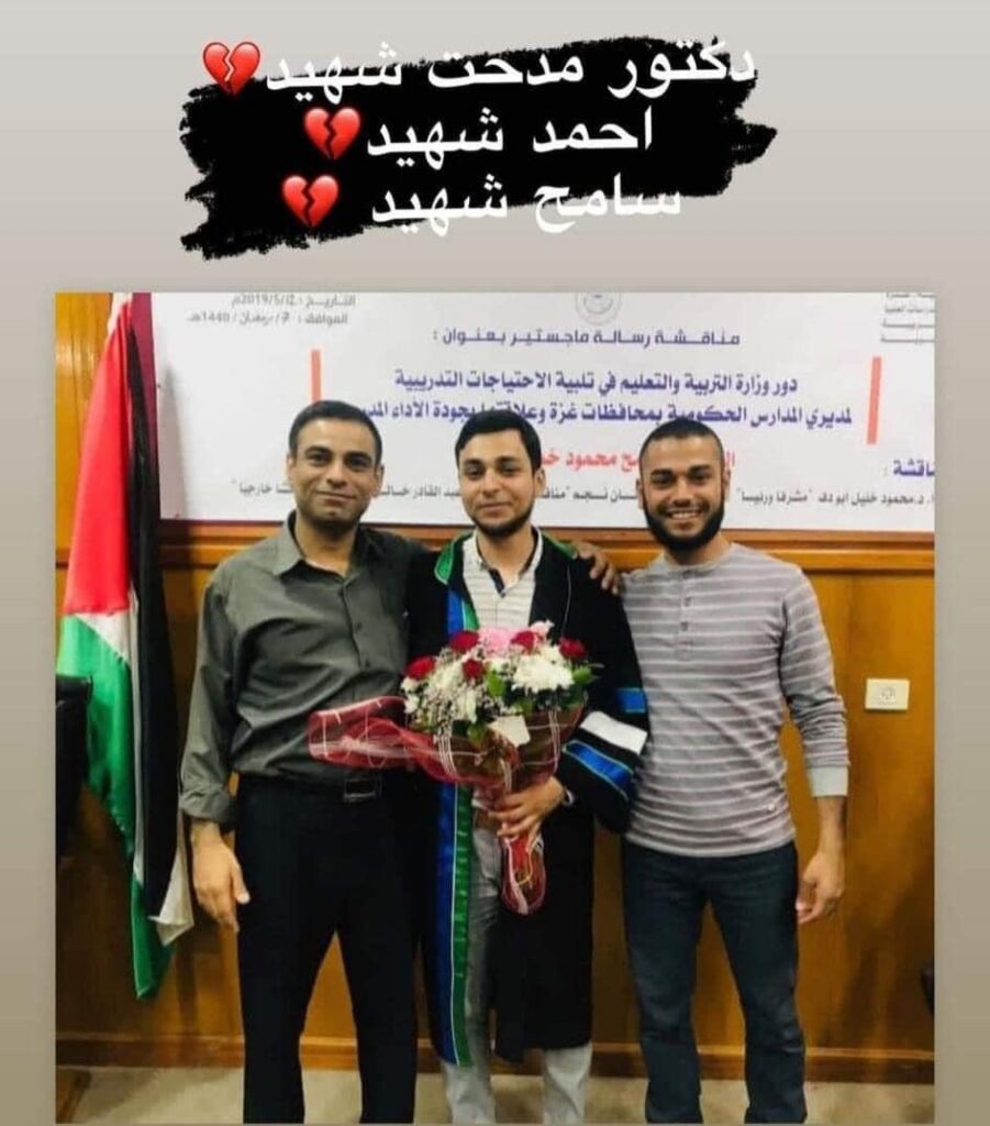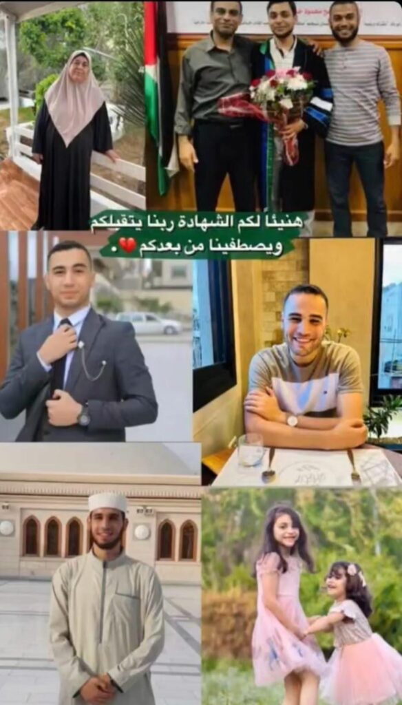 The same source mentioned the death of Medhat Saidam’s two brothers, and their family, namely: Ahmed Mahmoud Saidam and his wife Shamah Ahmed and their children. Another Facebook source, Hussam Al-Dajni, documented the names of the children as: Abdul Rahman Ahmed Saidam, Magda Ahmed Saidam, Maryam Ahmed Saidam, Fatima Ahmed Saidam, Sameh Mahmoud Saidam, his pregnant wife Suhad Iyad Al-Dajani, their unborn baby Rana Sameh Saidam, and their children Sameh Saidam and Mira Sameh Saidam.
