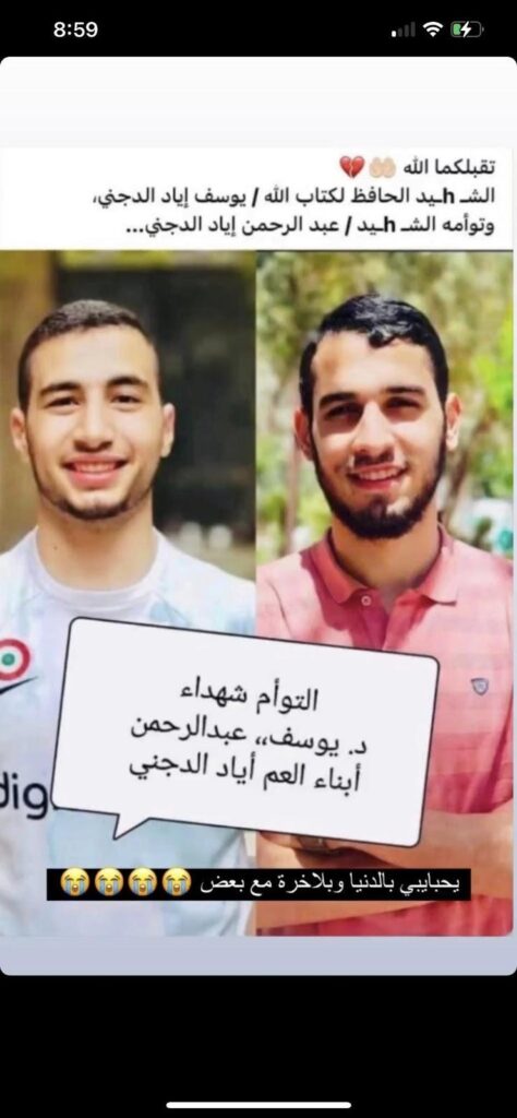 A Facebook post by Ahmad ALameen provided the names of additional victims killed, civilians also described by Hussam Al-Dajni as “Abu Jihad’s children and wife”: