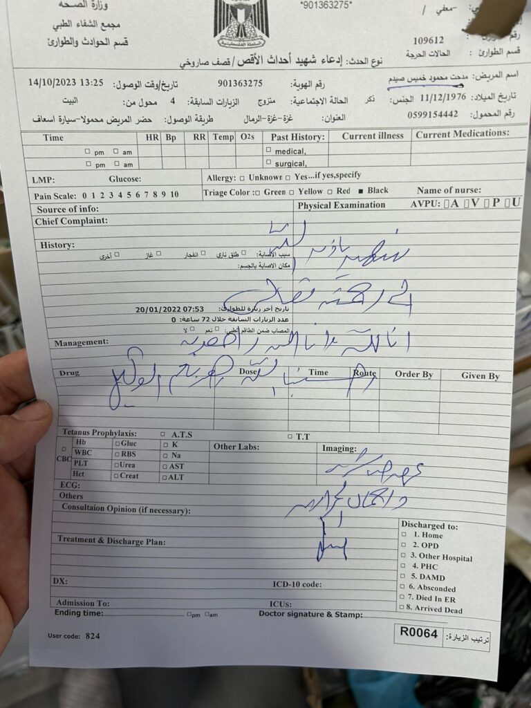 A Facebook post from the brother of Umm Medhat, named Hussam Al-Dajni, also documented the following civilian killed in the same attack: Balsam Farouk Al-Nono (Dr. Saidam’s sister in law). Multiple social media users described additional family members killed: Nawal Abdullah Ahmed Abu Nada (16 years old), Ahmed Abdullah Ahmed Abu Nada (15 years old), Anas Abdullah Ahmed Abundi (12 years old), Mohammed Abdullah Ahmed Abondi (6 years old), and Samah Abu Nada (Saidam). According to a Facebook post published by Anadolu Agency, those killed were all part of the same family unit. On this point, the outlet described them as the wife and four children of “Palestinian doctor Abdullah Abu Nada.” Footage of Abdullah Abu Nada grieving publicly was widely shared in the days following this incident. One Facebook user, posting on October 17, captioned this footage “Dr. Abdullah Abu Nada receives his family as martyrs 4 days after their house was targeted.” Other local sources added that the family was under the rubble during those 4 days.