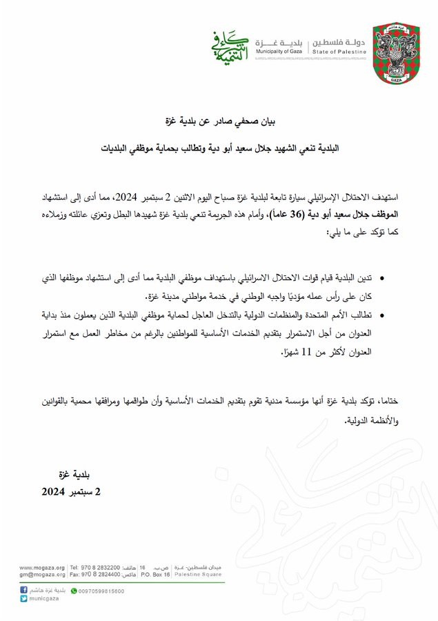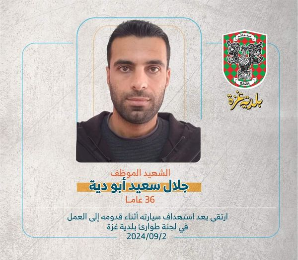 The Municipality of Gaza confirmed that one of its employees, Jalal Saeed Abu Diya, aged 36, was killed in the attack and “demanded” the protection of municipal employees in a press release. The Municipality also confirmed that Abu Diya was killed while on duty, “performing his national duty in serving the citizens of Gaza City.”