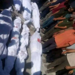 A photograph was shared of funereal rites, with a group of men praying over seven body bags, some blood stained.