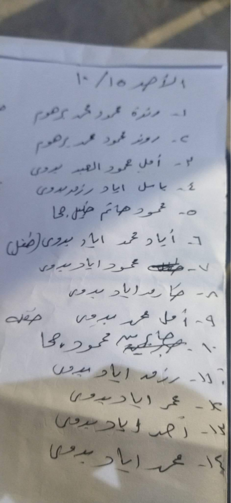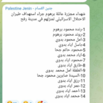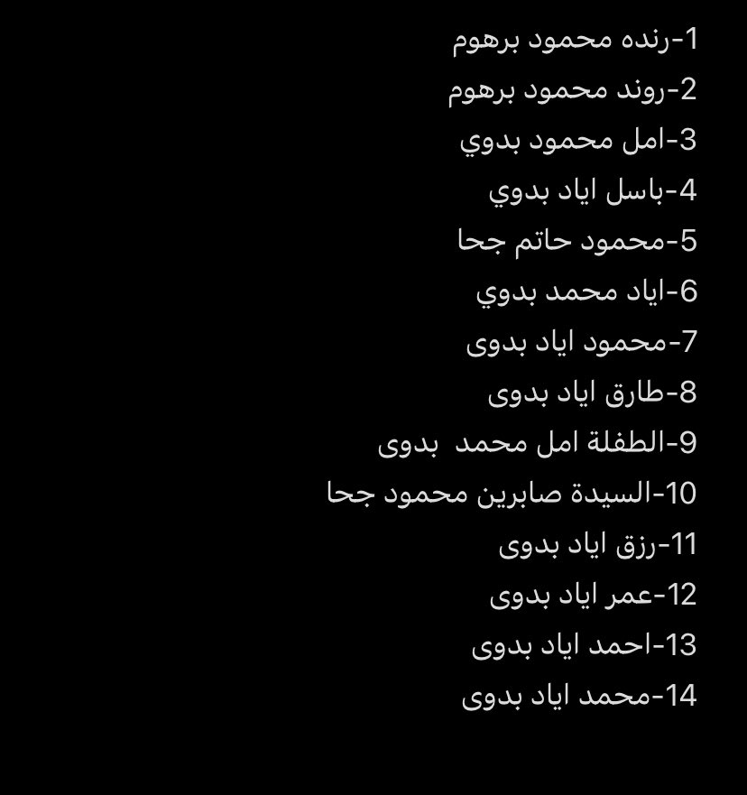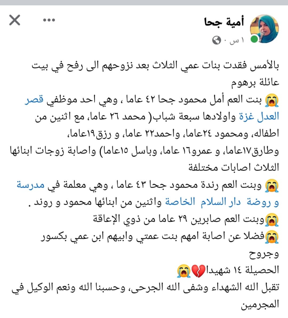 The victims were identified as 43 year old Randa Mahmoud Barhoum Jeha (wife of Mahmoud Muhammad Barhoum Abu Al-Baraa) who was killed alongside her daughter, 11 year old Rawand Mahmoud Barhoum, and Randa’s sister, 42-year-old Amal Mahmoud Jeha (Badawi), an employee of the Palace of Justice in Gaza. Seven of Amal‘s children were killed as well as two of her grandchildren. They were identified as 26-year-old Muhammad Iyad Badawi, his daughter Amal Muhammad Badawi and son, Iyad Badawi. 24-year-old Mahmoud Iyad Badawi, who was married, 22-year-old Ahmed Iyad Badawi, who was also married, 19-year-old Rizq Iyad Badawi, 17-year-old Tariq Iyad Badawi, 16-year-old Amr Iyad Badawi, and 15-year-old Basil Iyad Badawi. Mahmoud Hatem Jeha was killed as well as 33 year old Sabreen Mahmoud Jeha.