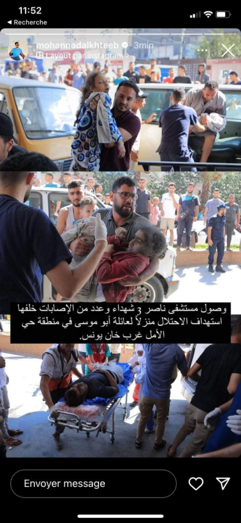 On October 15th 2023, five members of the Abu Musa family, including two children, a woman, and two men, were reportedly killed and at least two children from the same family and a man were reportedly injured by an alleged Israeli bombing in the Al Amal neighbourhood in Khan Yunis, located in the South of the Gaza Strip.