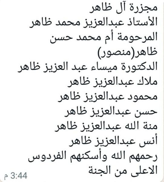 Facebook testimonies by Fatima Jaber and Amir Tariq Daher helped to ascertain the identities of the victims. Abdulaziz Muhammad Zaher was killed alongside his wife Umm Muhammad Hassan Zaher (Mansour) and their six children: a 22-year old daughter Dr. Maysaa Abdulaziz Muhammad Zaher, a 13-year old daughter Malak Abdulaziz Muhammad Zaher, an 11-year old daughter Mennat Allah Abdulaziz Muhammad Zaher, a 4-year old son Mahmoud Abdulaziz Muhammad Zaher, a 10-year old son Hassan Abdulaziz Muhammad Zaher, and a 1-year old son Anas Abdulaziz Muhammad Zaher.