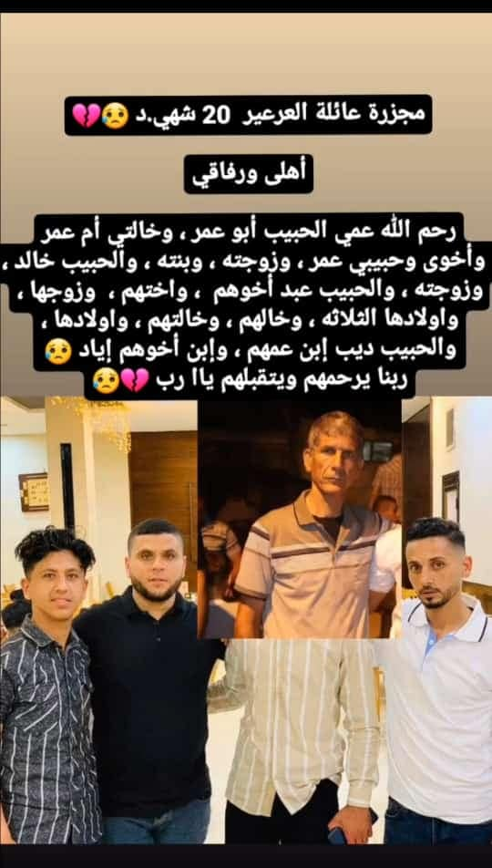 According to relatives on social media, among those killed are 58-year-old Imad al-Arair (Abu Umar), his wife Umm Umar, their sons 30-year-old Khaled al-Arair, 16-year-old Abd al-Qadir al-Arair and 31-year-old Umar al-Arair, Umar’s wife, and their daughter. Also killed were Imad’s daughter, her husband, her three children, as well as 37-year-old Deep al-Arair and Iyad al-Arair